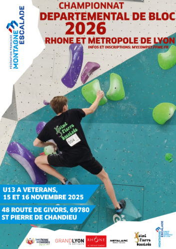 Le 15 & 16 Novembre aura lieu le championnat départemental de Bloc 2026 à Saint Pierre de Chandieu, oganisé par le club local, Saint Pierre Escalade, en collaboration avec le Comité du Rhône et de la Métropole de Lyon.